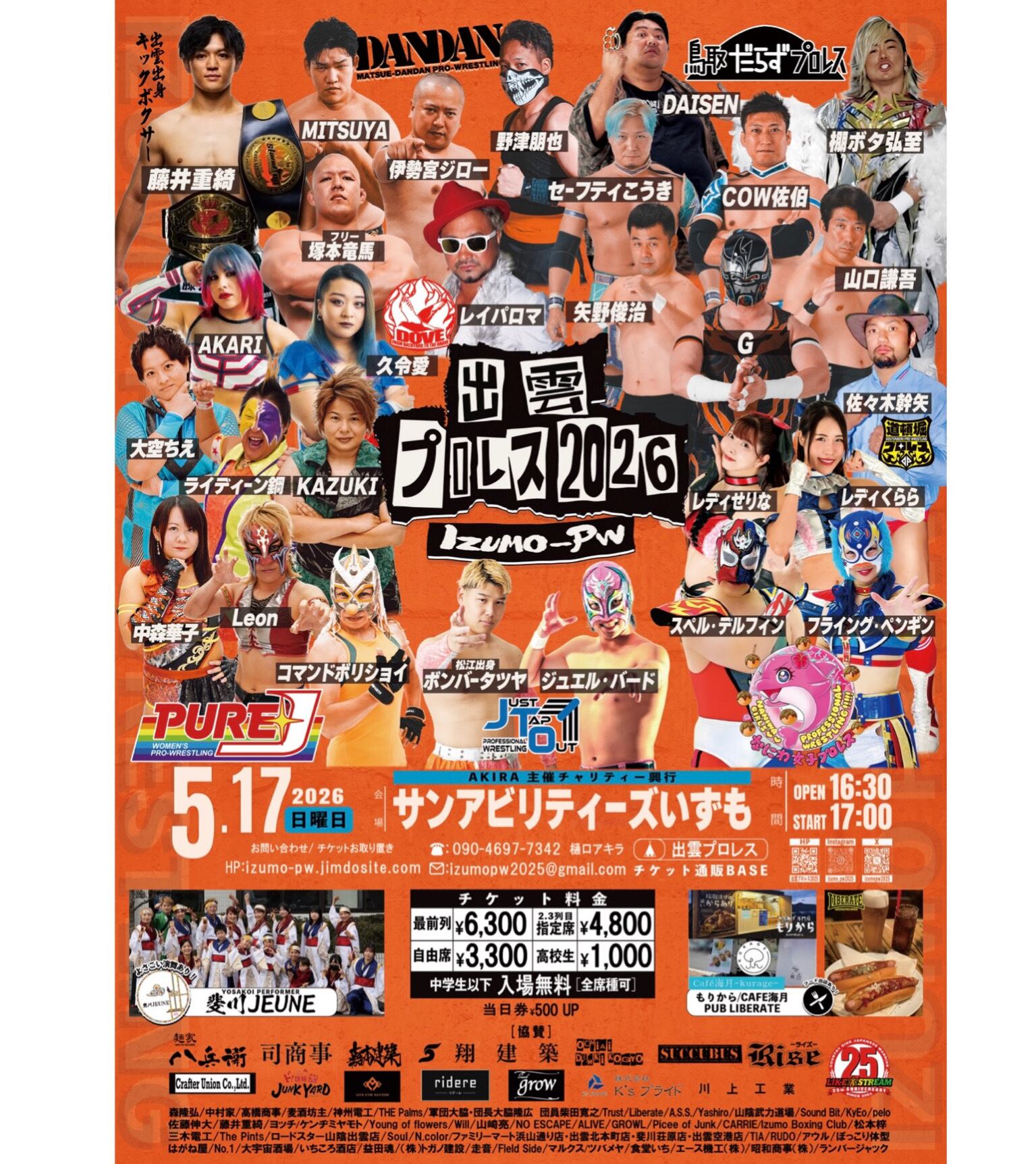 出雲プロレス2026 チケットです。正式なポスター画像できましたら更新致します。2列目残り少なくなっております!中学生以下は無料となります。お子様の座席が必要な方は購入後にお伝えください。
